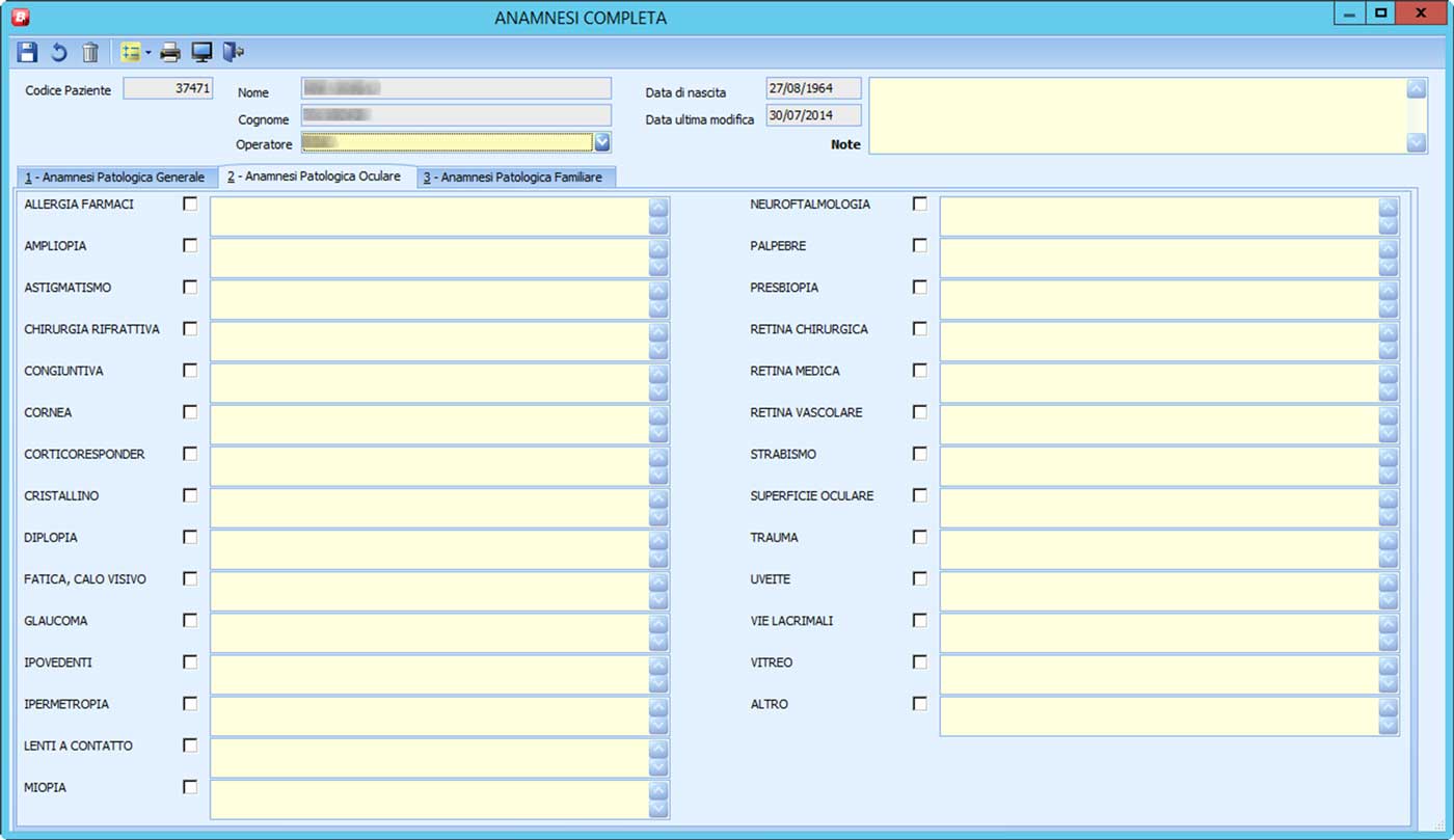 Pannello di visualizzazione dei dati generali del paziente, con la possibilità di gestire l’anamnesi, lo scadenzario e il foglio clinico associato