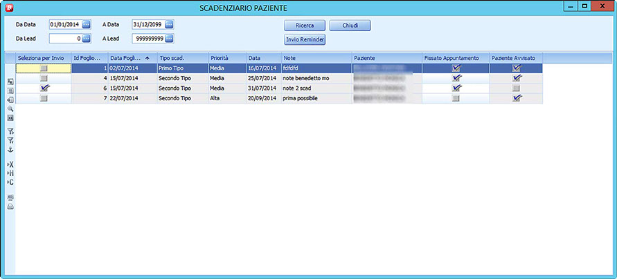 La gestione della parte clinica genera uno scadenzario di tipo clinico per il paziente, al fine di gestire appuntamenti a lungo/medio termine o attività inerenti la sfera amministrativa/clinica. Il pannello permette l’invio di e-mail/sms per il reminder al paziente.